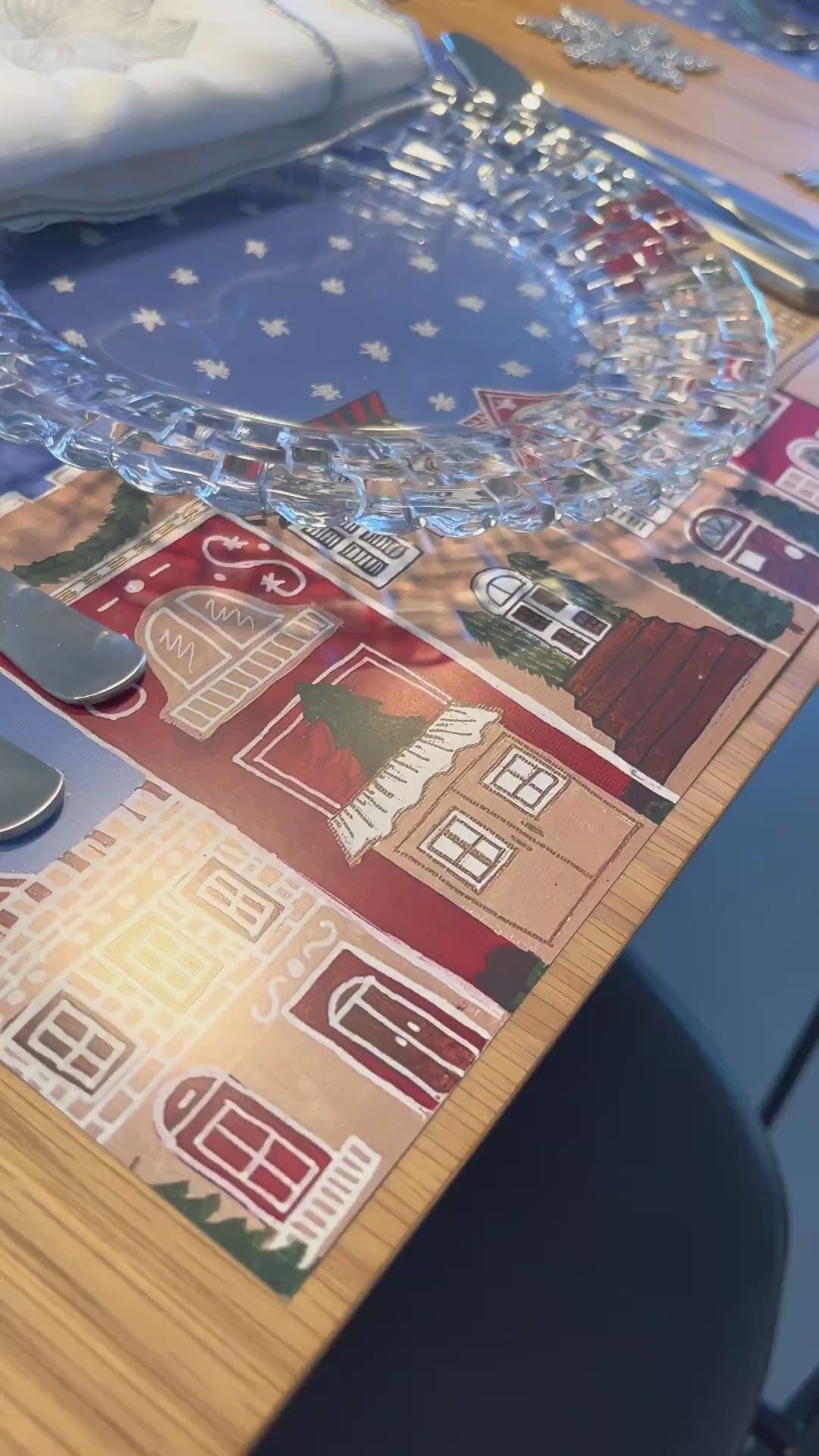 Ho Ho Ho, it's the most wonderful time of the year. And we are back with one of the most loved themes for this Holiday season. What screams hot chocolate and Christmas carols more than Ginger Bread Houses?! The artist Sarita Mishaan inspired by the cozy and vivid hues of red and blue hand painted this gorgeous design that will elevate any holiday table.