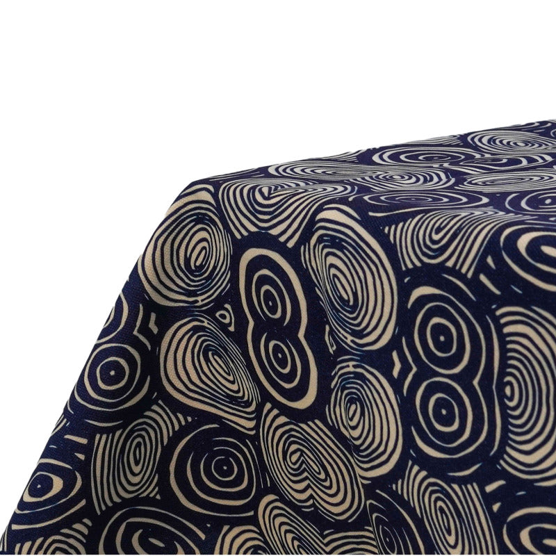 This eye catching tablecloth is water resistant, so you don't have to worry about spills and stains. Easy to clean just throw into the washer and thats it. The Navy blue and white flowy pattern was carefully designed by the artist to make any table wear pop.